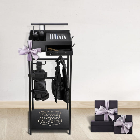 Police Gear Stand, Police Hanger, Tactical Duty Gear Rack with 3 Hooks, Combination Lock, Free-Standing All Iron Frame Police Gift Decor with Flag, Black, Come Home Safe